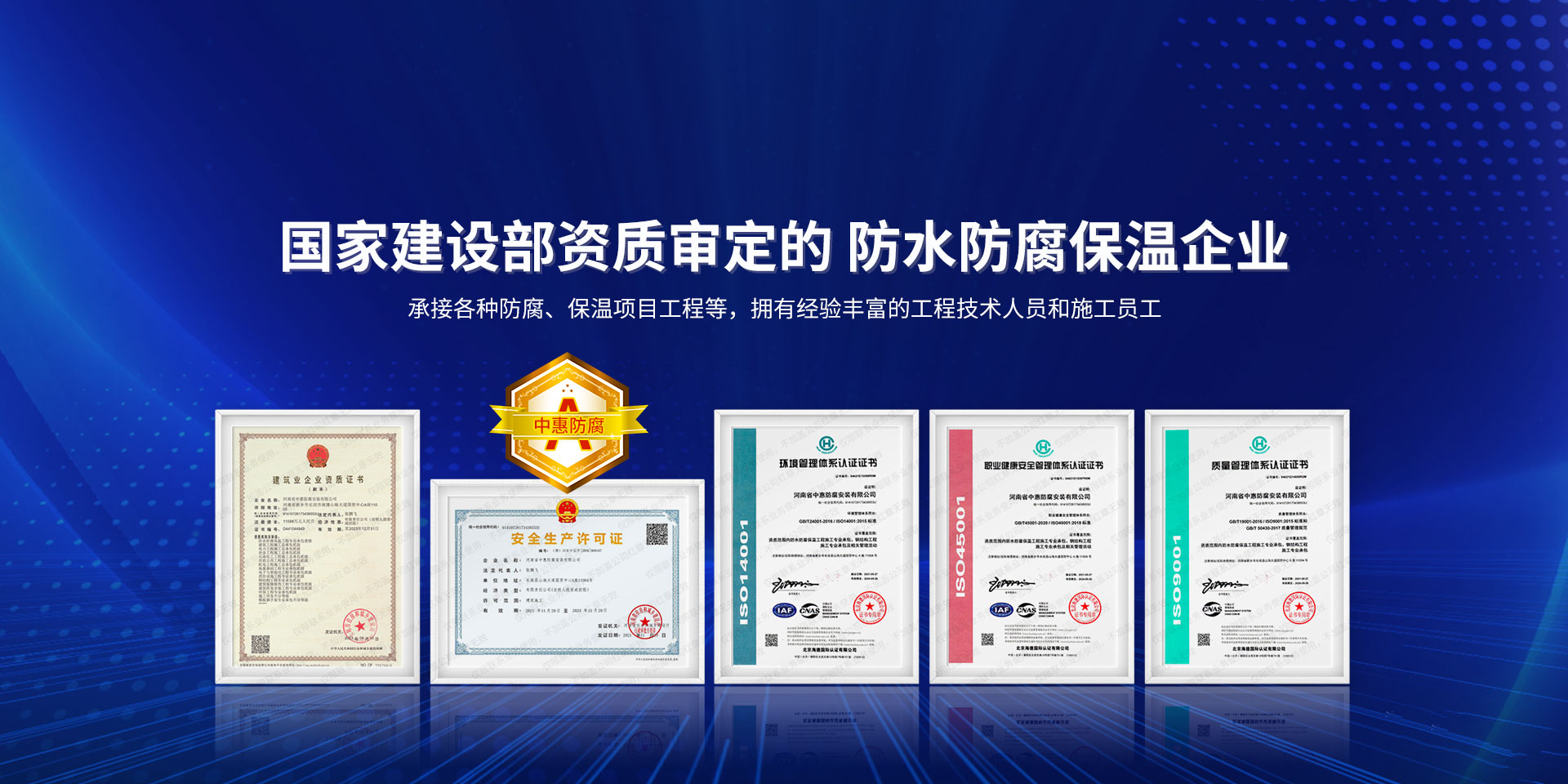 公司經營范圍:防水防腐保溫工程;消防設施工程;建筑裝修裝飾工程;建筑機電安裝工程;電力工程;建筑工程;石油化工工程;工業清洗工程;油罐清洗工程;鋼結構工程;環保工程;模板腳手架工程;電纜防火封堵、防污閃噴涂、外墻外保溫工程;各類施工勞務作業;設備維修、船舶鉚焊、涂裝;電力工程材料、建材、防水材料、防火材料、防腐保溫材料銷售,并相繼通過了GB/T19001-2008idtISO9001:2008GB/T50430-2007質量管理體系認證證書。GB/T24001-2004idtISO14001:2004環境管理體系認證證書。GB/T28001-2011idtOHSAS18001:2007職業健康安全管理體系認證證書。公司是中國防腐蝕于防護協會、中國施工企業管理協會、電力協會和中國鋼結構防水協會會員單位。 公司的經營業務涵蓋了石油、化工、電力、冶金、煤炭、船舶、國防、燃氣、水利、環保、交通運輸、航空及國防軍工和輕紡市政等行業的防腐保溫絕熱設備。鋼結構安裝、防火、防水、金屬噴鍍、聚脲噴繪、陰極保護、防滲透堵漏、玻璃鋼及各種磚版材料襯里、橡膠襯里、煙氣硫和耐酸溶劑腐蝕等工程施工。公司連續十年榮獲“省市先進施工企業”“安全生產先進單位”“重合同,守信用企業”和“AA***資質企業”的稱號。2000年被命名為市級文明單位,2002年被國家工商行政管理局命名為“重合同,守信用的企業”、被中國工業防腐蝕技術協會命名為“防腐蝕企業,能源節約及環境保護領域有豐富的經驗和***的業績。工程一次交驗合格率100%。其中攀枝花鋼鐵公司煉鐵廠四號高爐及熱風爐防腐工程、上海寶鋼公司煤氣柜防腐工程、撫順石油一廠裝置防腐項目、齊魯石化公司稀烴廠高塔防腐工程、吉林化學工業公司煉油廠油罐防腐工程、天津石化熱電廠六號爐頂棚聯絡管保溫工程、大慶油田(太倉)力神泵業工程、中國化學工程第十一建設工程、中原油田勘探局工程、中國石化銷售有限公司華北分部、魯皖輸油管道工程、貴州開磷息烽合成氨工程、陜西黃陵煤化工程、中國石油天然氣西部管道塔里木輸油工程、邯鋼集團邯寶鋼鐵公司煉鐵工程、德州供電工程、吉寶(南通)船廠工程,偃師華潤熱力工程、鄭州熱力總公司。 河南省中惠防腐安裝有限公司愿以豐富的施工經驗,***的技術,***的設備,***的管理,***的服務,竭誠為國內外廣大的用戶提供***滿意、******的工程作品。 我公司愿與國內外同仁一道,團結協作,共同推進防腐蝕行業發展! 公司地址:河南省長垣縣建設路北段360號 固定電話:0373-8866488 郵編:453400 網址:http://www_zhff_com_cn.ijeso.com